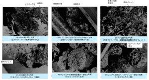 図2(a)~(c)に、炉心中央領域(G8,K9,D8)、炉心中間領域(G12,O7)、炉心外周領域(D4,N5,N12,O9)で採集されたボーリングサンプルの全体像を示す[2]。炉心中央では、溶融凝固層の上下が上下クラスト層によって囲まれていることが確認できる。炉心中間領域では、溶融凝固層がほとんど見られず、周辺クラスト層が確認できる。炉心外周領域からは、ほぼ無傷の燃料棒が回収された。上下周辺クラスト、溶融凝固層、切り株燃料棒から、詳細分析用のサンプルが採集された。
