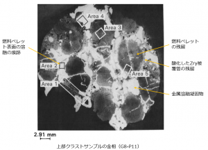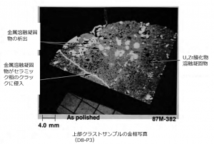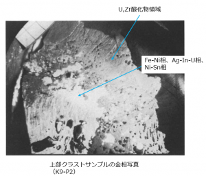 金属析出物(Fe-Cr-Ni、Ag-In)、金属メルトのセラミック中への流入と推定(上部クラストへ金属メルトが流入、)、溶融凝固は炉心のあちこちで非均質に発生したと推定