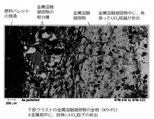 - 金属相部分では、デンドライト構造が観測され、凝固にある程度の時間がかかったと推定された(図5(c))[2]。これは、事故進展中の熱電対の実測値と整合していた(事故以降3日間は>1000K)。金属Zrが溶融した痕跡があることから、事故時ピーク温度は>2200Kと推定された。
