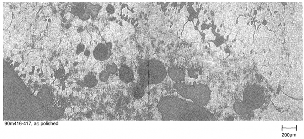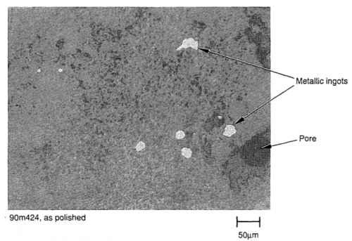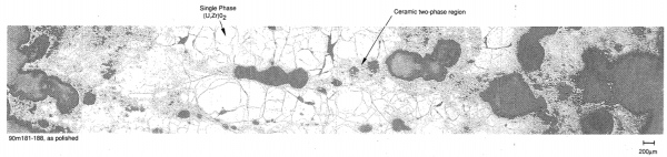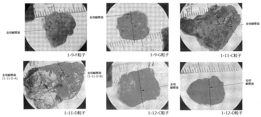 非破壊分析としては、外観観察、写真撮影、重量測定、かさ密度とデブリ粒子密度の測定、空孔率測定、が行われた。破壊分析としては、金相観察、SEM/EDX、EPMA、ICP-AES、放射線分析、等が行われた。 | 非破壊分析としては、外観観察、写真撮影、重量測定、かさ密度とデブリ粒子密度の測定、空孔率測定、が行われた。破壊分析としては、金相観察、SEM/EDX、EPMA、ICP-AES、放射線分析、等が行われた。 | ||