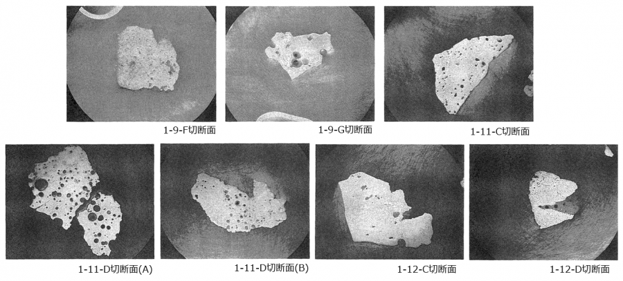 非破壊分析としては、外観観察、写真撮影、重量測定、かさ密度とデブリ粒子密度の測定、空孔率測定、が行われた。破壊分析としては、金相観察、SEM/EDX、EPMA、ICP-AES、放射線分析、等が行われた。