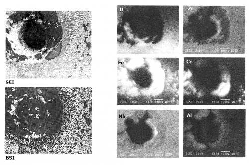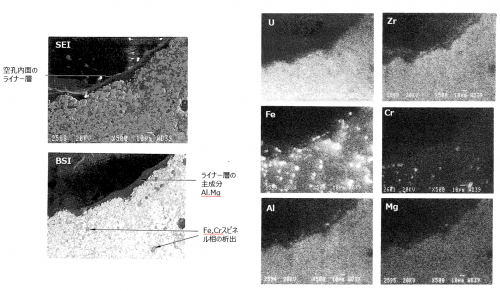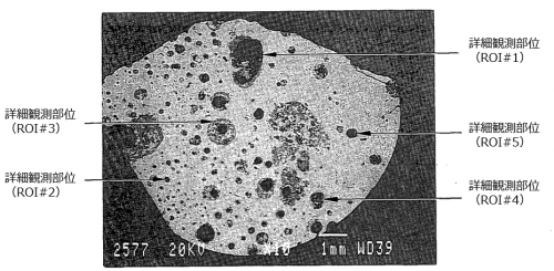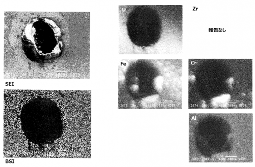 * 空孔の形成メカニズムとして、水蒸気の取り込み、構造材金属の蒸気によるバブリングが原因と推定された。[[ファイル:VIP 14.png|サムネイル|600x600ピクセル|'''<big>図6 下部プレナムハードデブリの断面金相拡大(1-9-F粒子)[2]</big>''']]
