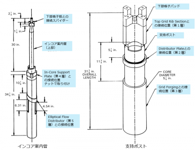 • 第4層(In-core Guide Support Plate): 第3層のフローホールの下で、インコア案内管をボルトナットで取り付け、支持する役割を担っている。厚さ50.8mmのSS製プレートである。第4層の上で、インコア案内管の外径が細くなり、第1~3層のフローホール内に挿入されている。