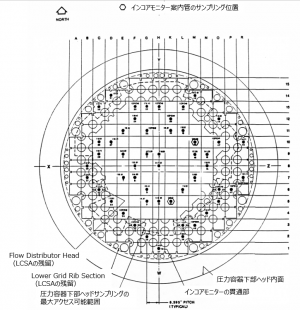 MDM装置を使ったはじめてのサンプリングのため、事前にサンプル個数や重量を正確に見積もることができなかった。しかし、30日間で8~20個くらいのサンプル採集を目標として、結局、ヘッド内面サンプル15個、ノズルサンプル14個、インコアモニター案内管サンプル2個の回収に成功した[1]。図2に、サンプル採集位置を示す[8]。