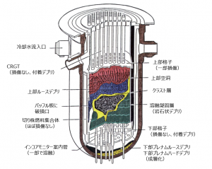 1979年3月にTMI-2事故が発生した。事故直後は、炉心損傷は限定的との推定が主流であったが、1982年7月に、Quick Look調査により、原子炉圧力容器内部がCCTVカメラで調査され、炉心上部は空洞となっており、デブリが崩落・堆積していることが明らかになった[2]。その後のボーリング調査[3]や下部プレナム調査[4]により、事故後の圧力容器内の状態(TMI-2最終形態)が推定された(図1)[5]。下部プレナムには、約19トンのデブリが移行したと推定された。