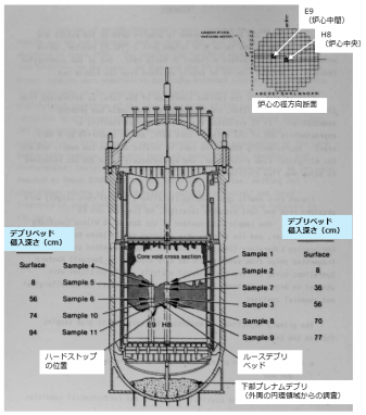 • 1983年9~10月と1984年5月に、クラムシェル型と回転式の探査棒型のサンプリングツールを用いて、炉心中央(H8位置)と炉心中間部(E9位置)において、上部ルースデブリのサンプリングが行われた(合計11カ所)。
