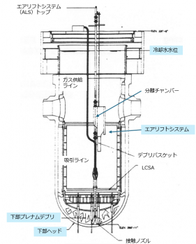 - エアリフトでは、ノズル先端にガスバブルを注入して気液混合相を形成させ、稠密な水相との比重差により、気液混合相が細管内を上昇する力で、ノズル先端からデブリ粒子を吸引する。細管の上部は分離チャンバーになっており、流速を低下させることで気体、液体、固体の分離が行われる。ガス相は、装置の上部から排気され、液相は冷却水に還流される。粒子デブリは、分離チャンバー底部に堆積し、斜めになった底面を移動して、デブリバスケット内で回収される。デブリバスケットはそのまま収納缶に装荷される。