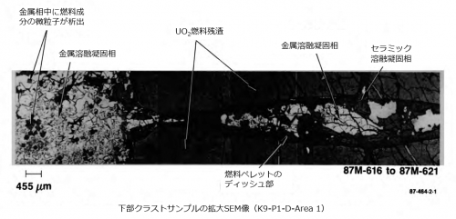 - 溶融凝固層は均質性が高く、金属デブリ粒子、セラミックデブリ粒子、混合物粒子からなっていた。