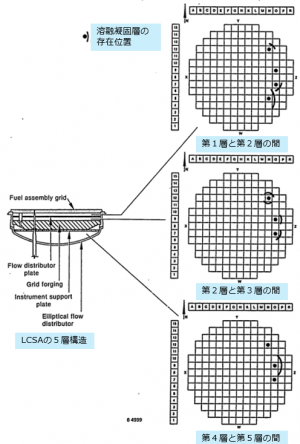 図10に、切り株状に残留していた燃料棒上端位置の等高線図を示す[24]。この図に示された高さ位置は、燃料棒の残留長さではなく、建屋の298ftレベルからの距離であることに注意が必要である。燃料棒の残留長はこの長さから約30~40cm短い。燃料棒の残留長さは炉心中央で最も短く(約30cm)、外周にむかうほど長い(約1.0~1.4m)ことがわかる。燃料棒の上には下部クラスト層が堆積しており、その形状はおよそ漏斗型であったことがわかる。図11に、LCSAの観察部位を示す[24]。ボーリング孔から挿入した小型カメラにより、観察された範囲は限定的(全体の約50%)であるが、LCSAに大きな損傷がないことが確認された。特に炉心中央ではほとんど損傷が見られなかった。一方で、炉心東側では、外周部からLCSAに向けて溶融デブリが侵入した痕跡が見られた。その様子を、図12に示す[24]。上から、LCSAの第1層と第2層の間、第2層と第3層の間、第4層と第5層の間での、溶融デブリの親友範囲を示す。下部プレナム領域については、K9,N12,D4位置でボーリング孔がLCSAを貫通し、下部プレナムデブリの表面状態が観測された。主に粒子デブリが堆積しており、一部に塊状のデブリが見られた。