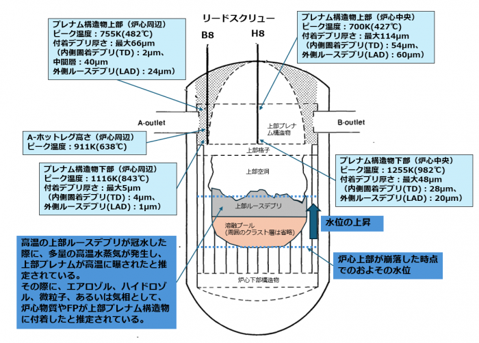 一方で、リードスクリュー支持管サンプルの分析結果は、リードスクリューサンプルの分析データ(上述)と整合していた。おそらく、上部ルースデブリが冷却水で再冠水したタイミングで、上部プレナムが高温水蒸気に曝され、FPや制御材のエアロゾルが付着したと推定された。