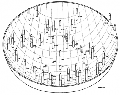 • 1985年に下部プレナムのビデオ調査[4]、1986年にコアボーリング調査[5]がそれぞれ実施された。前者の調査では、上部プレナム構造物撤去後に、容器槽と遮蔽体の間の円環状の隙間を使って、下部プレナム周辺部が調査された。同時に下部プレナムルースデブリサンプルが採集された。後者の調査では、炉心中央から中間領域にかけて、合計10本のボーリングが行われ、うち3本はLCSAを貫通し、下部プレナム中央部のビデオ調査が行われた。