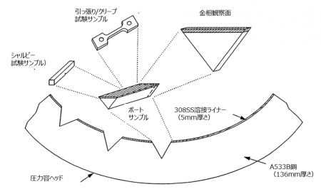 圧力容器の下部ヘッド母材は、136mm厚さのA533B鋼からなっており、その表面に5mm厚さの308L-SS製のライナーが溶接されていた。図2に、Vesselサンプルの採集例を示す[1]。MDM装置により、プリズム型のボートサンプルが回収された。ボートサンプルの一断面を切り出し、金相観察が行われた。また、サンプル母材から。引張試験やクリープ破断試験用のサンプル、あるいは、シャルピー試験用のサンプルが切り出された。