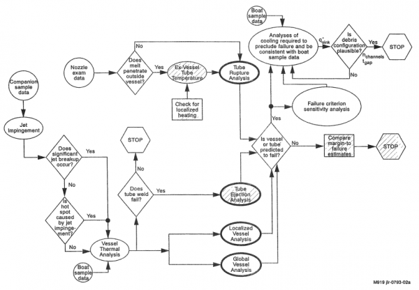 図17に、解析フローチャートを示す[1]。入力データとして、事故時プラントデータ(RPV内圧、冷却水温度、水蒸気流量)、TMI-2内部調査データ(デブリ分布、デブリ/ノズルギャップ、デブリ/Vesselギャップ、デブリ重量)、VIPプロジェクトでの分析データ、が用いられた、次に、予備解析として、ノズル内への溶融デブリ侵入と閉塞解析、デブリジェットによるヘッドへの熱・機械的衝撃解析が行われ、マージン評価のための条件設定が行われた。