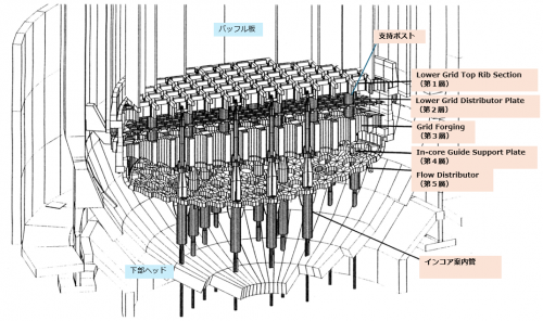 - 第5層(Flow Distributor): 炉心部に冷却水を供給する構造物であり、この層だけは半球状(楕円形状)の構造物となっている。厚さ50.8mmのSS製プレートとなっている。インコア案内管の貫通部分は溶接されている。溶接部の下側には、ガセットが取り付けられている。