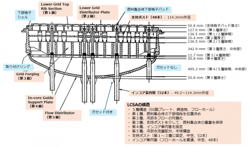 図3に、LCSA構造物の模式図を示す[8,12]。LCSAは、水平な5層構造(SS製、鋳造物)とそれを貫通する縦方向の構造物(支持ポスト、インコア案内管)で形成されている。また、冷却水のフローホールが数多く存在している。