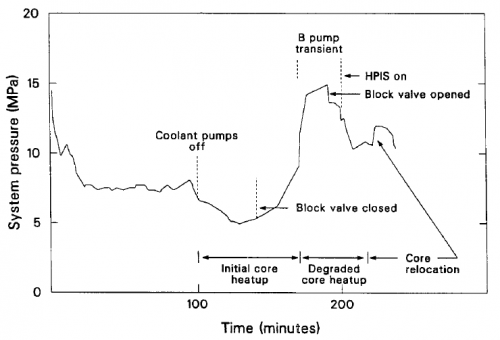 図1に、TMI-2事故でのスクラム後約4時間までのRPV内圧力変化と主なイベントを示す[2]。TMI-2事故では、1979年3月28日午前4時に、二次系給水流量の喪失事象が発生し、タービンがトリップし原子炉が自動停止した。その後、加圧器逃し弁(PORV)の開固着、高圧注水ポンプの手動停止などにより、スクラム後100分で冷却水供給が停止し、炉心水位が低下、炉心上部から次第に燃料が露出し、燃料溶融開始した。スクラム後174分にB系ポンプ1基が短時間再稼働し、冷却水が投入されたことにより、内圧上昇した。この際に炉心上部で空焚き状態だった燃料集合体に熱・機械的な衝撃が加わり、大規模に炉心崩落したと考えられている。その後、崩壊熱を除熱しきれずに、炉心部で溶融デブリプールが成長した。スクラム後約224分に、溶融デブリ約19トンが下部プレナムに移行した。この事象により、炉心部と下部プレナムでデブリが冷却される状況となった。