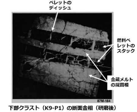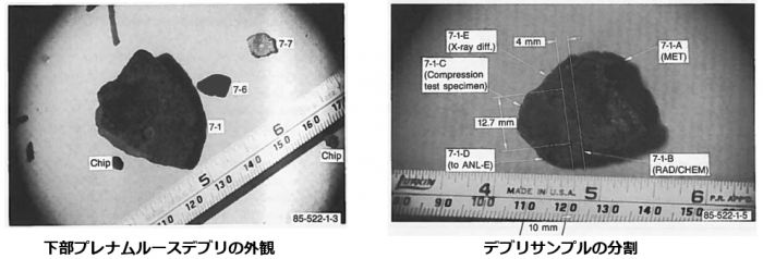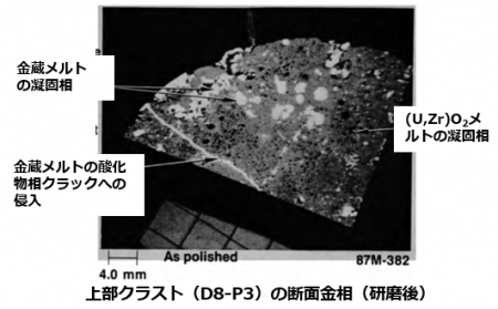 ・サンプル分析により、酸化物、金属、混合物の3領域に大別されること、酸化物相には燃料棒由来成分だけでなく構造材由来の酸化物も含まれること、その凝固時に酸化物相が固液分離したこと、などを推定