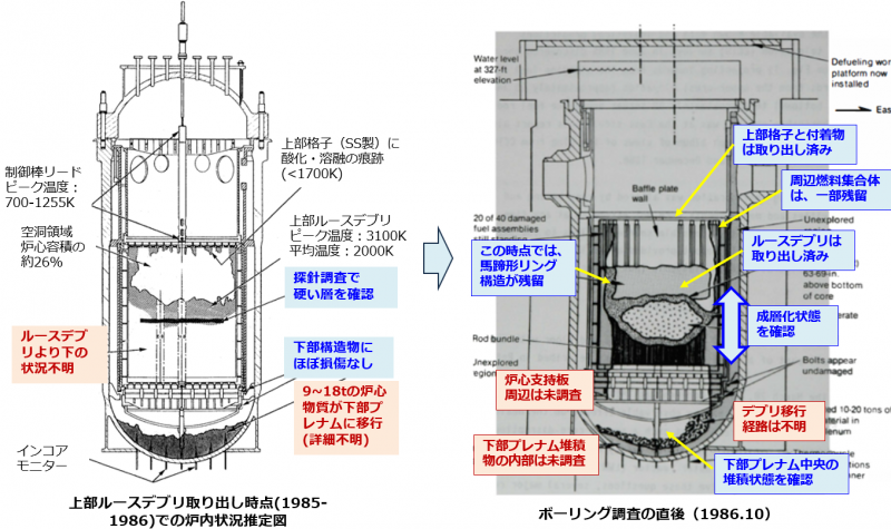 上部ルースデブリは、長尺ツールを用いて瓦礫状のデブリをデブリバケツ中にいったん回収し、それをFuel収納缶の上部に漏斗状の構造物をとりつけて、上から投入するという方式で回収された。また、粒子状や粉末状のデブリについては、真空吸引システムが使用された。しかし、Knockout収納缶、Filter収納缶でつまりが多く発生し、予め設けてあったバックフラッシュ系統を使っても、十分につまり除去できなかった。このため、真空吸引方式の稼働率は高くなかった。他方、ブラインド作業でデブリ取り出しが進むと、炉心の周辺部に残留していた燃料集合体の下部内側に、瓦礫状の燃料デブリや破損燃料棒などが凝集固着している円環状の構造があることがわかってきた(燃料集合体一体分程度の幅)。これは馬蹄形リング構造と称された[19]。冷却水の水質改善に伴って、馬蹄形リング構造の全体像が明らかになり、ビデオ調査が行われた。この知見は、事故進展の推定やコアボーリング計画の具体化に利用された。上部空洞の周辺では、約40体の燃料集合体が残留していたが、ほぼ無傷な2体を除いて、部分的に溶融しお互いに固着していることが確認された。この段階(1986年上期)で、炉心中央下部から下部プレナムにかけての領域以外について、炉内状態がほぼ明らかになった。まだ、調査が行われていない炉心中央より下の領域については、事故進展解析の結果と炉内状態に関する知見に基づき、上部ルースデブリ下のハードストップ以下に、溶融凝固デブリ層や切り株状の燃料が存在している可能性、その境界にクラスト層が形成されている可能性、炉心部から溶融デブリが下部プレナムに移行した可能性、等が推定された。そこで、次の段階での燃料取り出し対象領域となる、炉心下部の状態を調べるために、コアボーリング計画が進められた[20]。