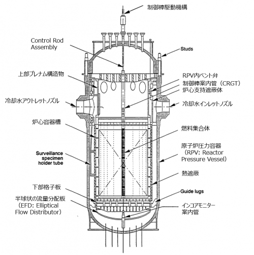 • 制御棒スパイダー(図4(e)): 61体の燃料集合体に取り付けられていた。長さ約3.3mの制御棒は、304L被覆管内にAg-In-Cd材が装荷されていた。事故時には炉心に全挿入されていた。