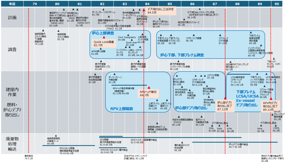 図1 TMI-2事故炉クリーンアップの時系列 [1,2,3などから編集]