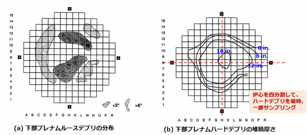 ・比較的表面側のルースデブリ中では、堆積物サイズは微粒子から約0.2mまで、比較的底部側のハードデブリは、0.5~0.7m深さの溶融凝固層