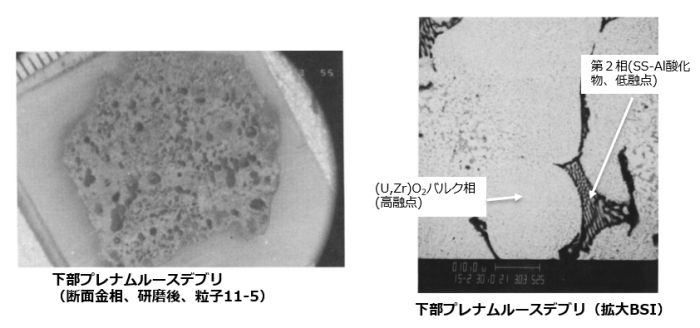 (参考:燃料デブリの分析(特徴、経験温度)参考:TMI-2での事故進展に伴うデブリ移行挙動、参考:RPV下部ヘッドで採取された燃料デブリ試料の分析結果(微細構造)とデブリ移行メカニズムの推定