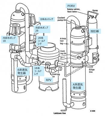 図5に、冷却水一次系(RCS: Reactor Coolant System)の模式図を示す[1]。RCS系は、RPV、蒸気発生器2器、冷却水ポンプ4基、加圧器1器、配管類で構成されている。2系統の冷却水フロー(A系統、B系統)があり、それぞれポンプ2基、蒸気発生器1器で構成されている。冷却水中にはホウ酸が溶解されており、その濃度によりおよそ出力制御できるシステムになっている。