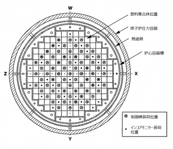 炉心部には、全長約4mからなる燃料集合体が装荷されている。炉心の周囲は、長方形プレート状のバッフル板を組み合わせて覆われており、その外側はコアフォーマ領域と呼ばれる。コアフォーマ領域には8層の円環状のコアフォーマプレートが取り付けられている。コアフォーマ領域の外側には炉心容器槽が配置され、さらに熱遮蔽体が装荷されている。その外側には、RPVとの間に円環状の隙間(ダウンカマー)が存在している。図中には、炉心中央の燃料集合体のみ図示されている。バッフル板、コアフォーマ領域、炉心容器槽、熱遮蔽などは上部炉心支持構造物(UCSA: Upper Core Support Assembly)と呼ばれる。図2に、燃料集合体の模式図を示す[1]。炉心部に、燃料集合体が177体装荷されている。一体あたり208本の燃料棒、16本の制御棒案内管、1本の計装案内管が装荷されている。制御棒案内管内には、炉心の位置によって、制御棒や可燃性毒物棒など種類の異なる炉心物質が装荷される。燃料集合体の上下には上下端栓が取り付けられ、それぞれ上下格子板にはめ込まれ、固定される構造となっている。燃料集合体の途中には、燃料棒を固定するためのインコネル製のスペーサーグリッドが取り付けられている。UO2燃料ペレットの重量は93.1トンであった。UO2ペレットはZry-4製の被覆管に装荷され、上下をZry製の端栓で封入されていた。UO2ペレット密度は92.5%であった。制御棒案内管はZry-4製で、制御棒や可燃性毒物棒の被覆管はSS製であった。制御材にはAg-In-Cd合金ロッドが使用され、可燃性毒物にはAl2O3-B4Cのペレットが使用された。RPV外側には、ソースレンジモニターがとりつけられていた。